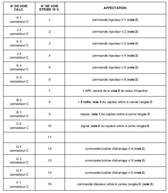 AFFECTATION DES VOIES DU CONNECTEUR ETRIER 15 VOIES NOIRS DU SOUS-FAISCEAU INJECTION (au-dessus du banc de cylindres rangée A).