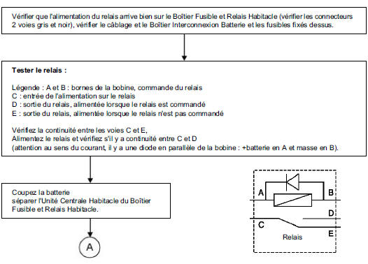 Vérifier que l'alimentation du relais arrive bien sur le Boîtier Fusible et Relais Habitacle (vérifier les connecteurs 2 voies gris et noir), vérifier le câblage et le Boîtier Interconnexion Batterie et les fusibles fixés dessus.