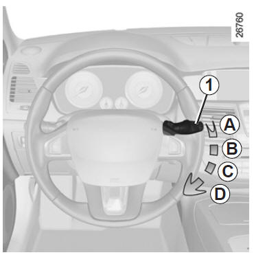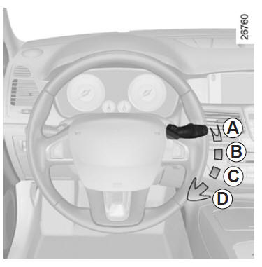 Pour tous les véhicules, la position C est accessible contact mis et les positions B et D sont accessibles uniquement moteur tournant.