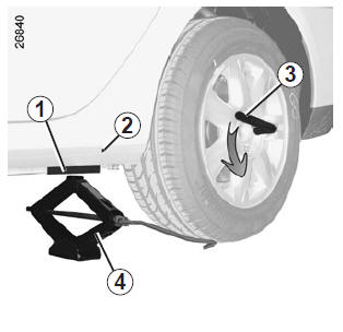 Présentez le cric 4 horizontalement, la tête du cric doit être positionnée à hauteur du renfort tôle 1 le plus proche de la roue concernée, signalé par une flèche 2.