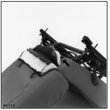 Dégager les bandes de retenue arrière de la coiffe de dossier. Déclipser les fixations de coiffe sur la cassette d'airbag, puis relever partiellement celle-ci en partie arrière.