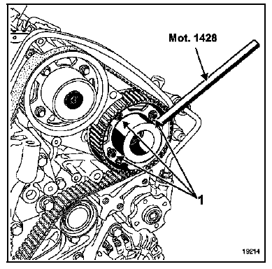 Pour cela, desserrer les vis des pignons d'arbres à cames (1) et tourner les moyeux d'arbre à cames à l'aide du Mot. 1428 (moyeu d'arbre à cames d'échappement) et du Mot. 1555 (moyeu d'arbre à cames d'admission) afin de faciliter la mise en place des piges.