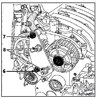 Serrer l'écrou épaulé (6) et la vis (7), puis amener en contact les pignons du Mot. 1509 avec les poulies d'arbres à cames tout en serrant les écrous (8) au couple de 8 daN.m.