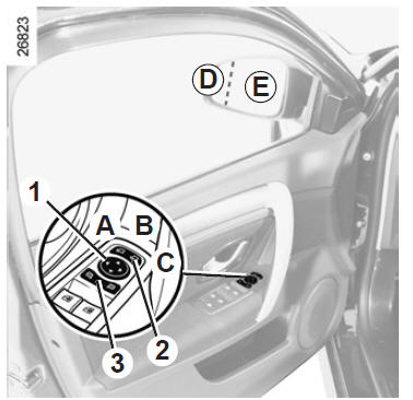 Sélectionnez le rétroviseur à l'aide du contacteur 3, puis avec le bouton 1, réglez- le jusqu'à la position souhaitée.