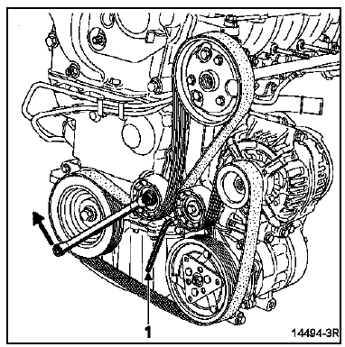 Faire pivoter le tendeur automatique de la courroie dans le sens indiqué ci-dessous à l'aide d'une clé polygonale contre coudée de 13 mm. Brider le galet tendeur à l'aide d'une clé six pans (1) de 6 mm.